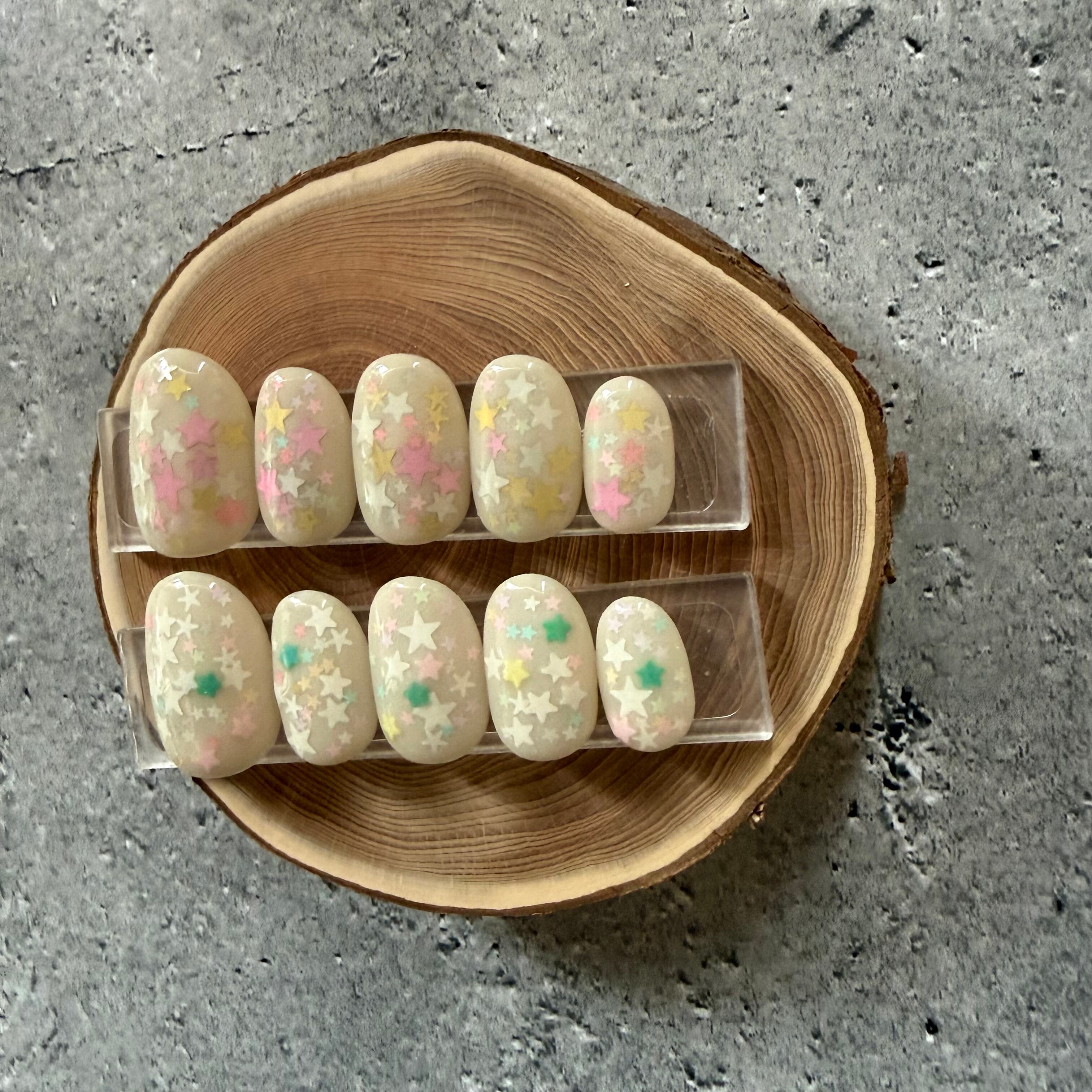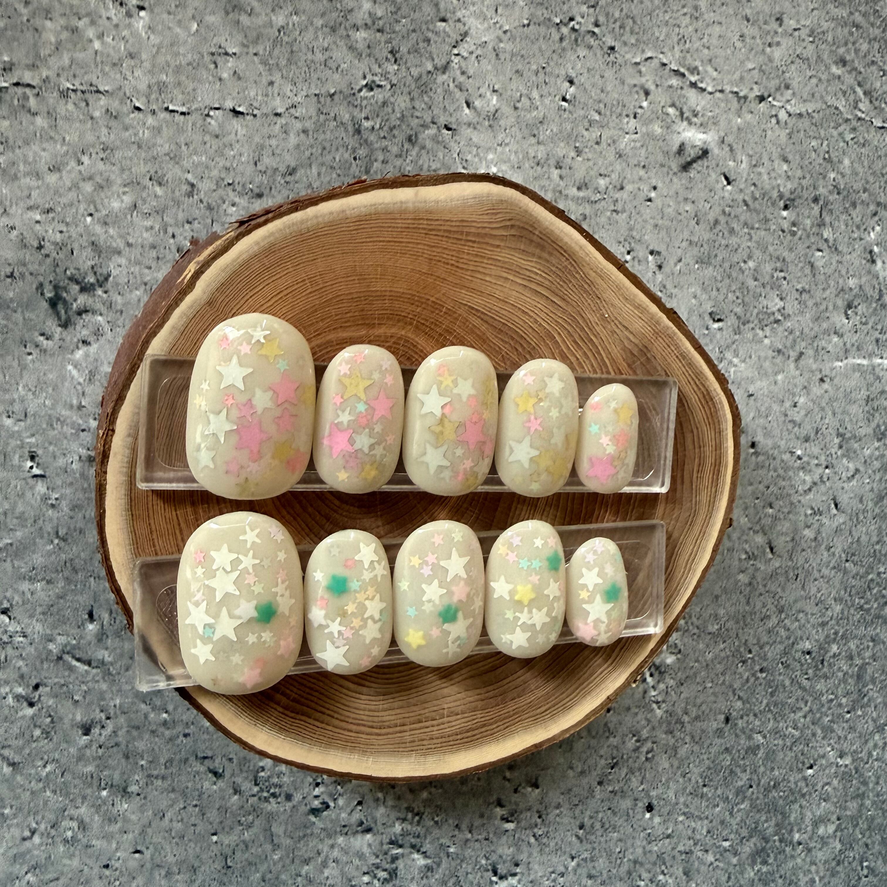 右左でニュアンスが違う星のホログラムを埋め込んだ、春らしいミルキーカラーのデザイン。